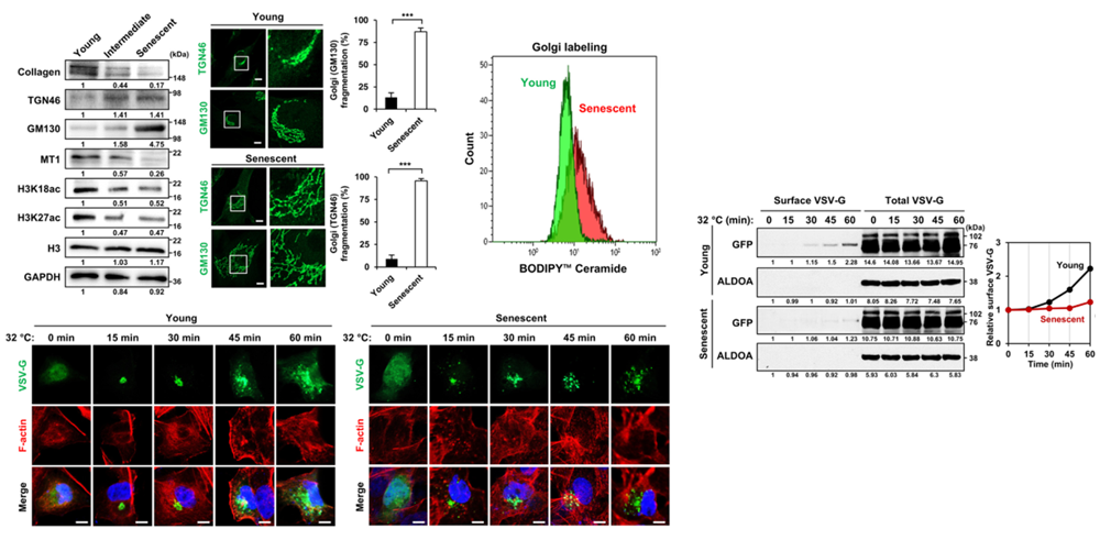 然而,隨着衰老,這個“物流中心”也開始出現問題。具體表現為與蛋白質加工、輸送有關的蛋白(TGN46、GM130)表達量顯著增加,體積膨脹、結構鬆散,運輸蛋白的效率降低,出現了所謂的“高爾基體壓力”的現象。