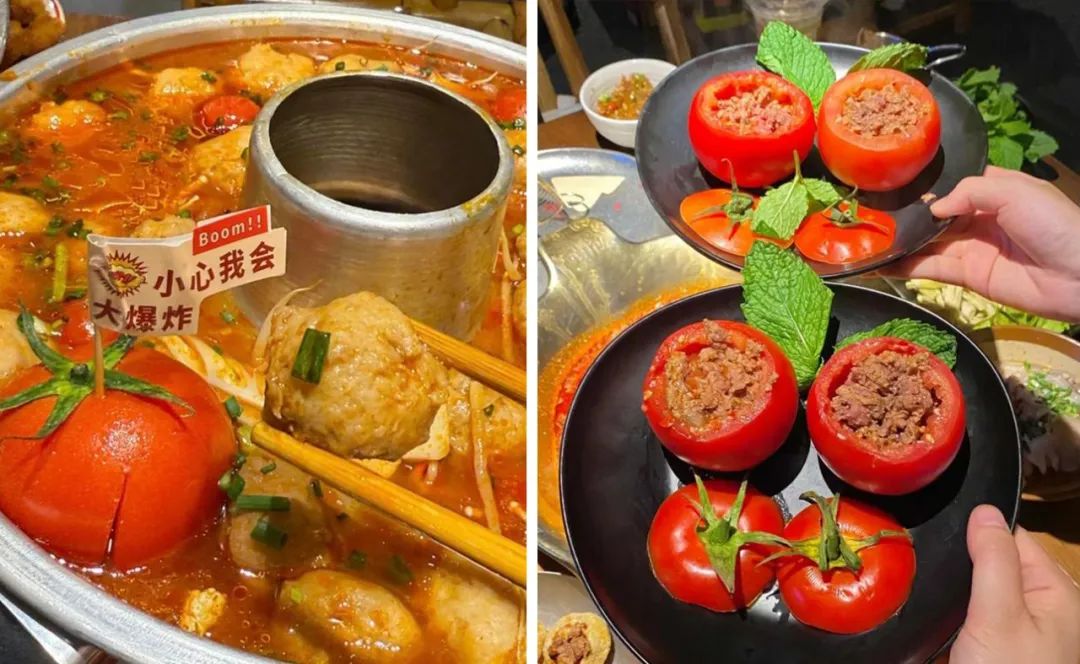 番茄還是產品研發的心頭好。廣東江門的巴川君市井小火鍋,把番茄鍋放入整顆番茄,用標籤“提醒”顧客小心會炸開,其實門店在番茄底部做了十字花刀,不必擔心內部遇熱炸開;喀喀火鍋將番茄與牛肉滑結合,放入番茄鍋中,鮮量加倍。