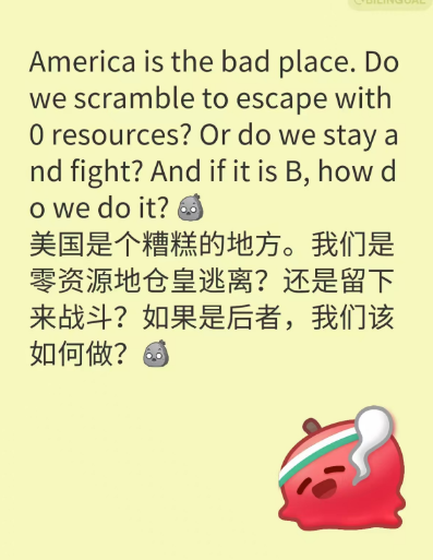 起因是中美網友對賬後,很多美國朋友破防了,既悲憤又彷徨,居然在討論“咱們是戰鬥呢,是要逃離這個狗屁地方”?我一看這意志不堅定啊?這樣下去可不行,決定教育一下美國的朋友們,幫他們下定決心。