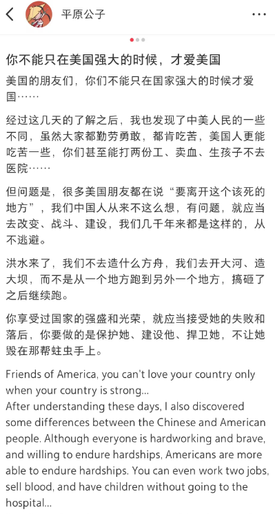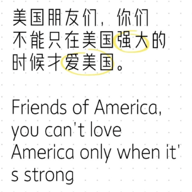 我在小紅書發了個帖子,叫做《美國朋友,你們不能只在美國強大的時候才愛美國》。