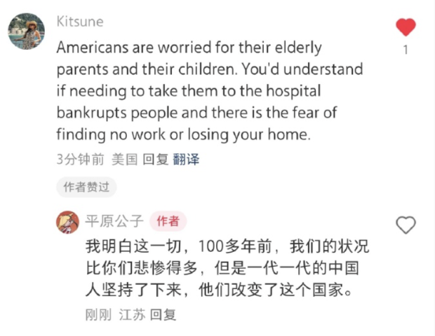 也有的繼續訴苦,有位姐妹説:“Americans are worried for their elderly parents and their children. You’d understand if needing to take them to the hospital bankrupts people and there is the fear of finding no work or losing your home.”