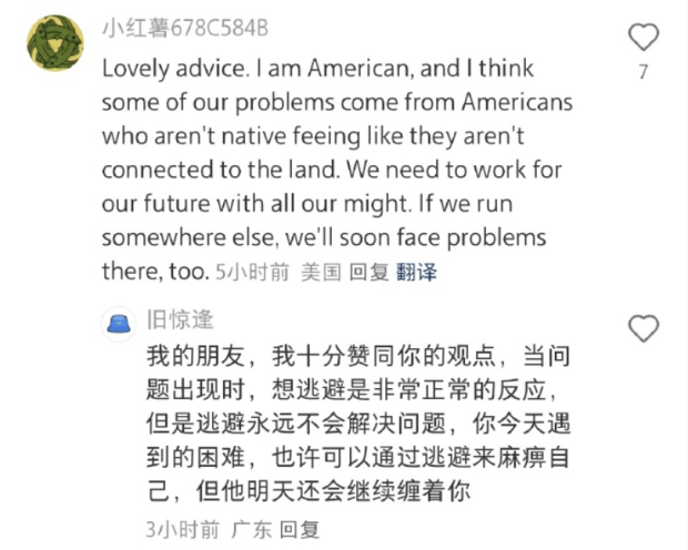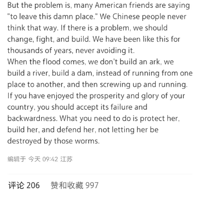 “但問題是,很多美國朋友都在説“要離開這個該死的地方”,我們中國人從來不這麼想,有問題,就應當去改變、戰鬥、建設,我們幾千年來都是這樣的,從不逃避”。