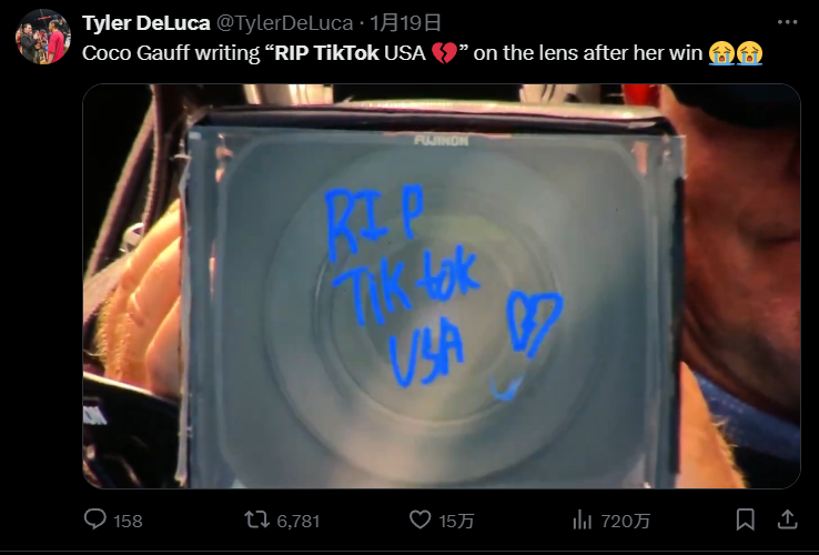 隔壁正在澳大利亞打比賽的美國選手高芙成功進入 8 強後,在攝像機鏡頭上深情寫下:RIP TikTok USA ( 心碎 )