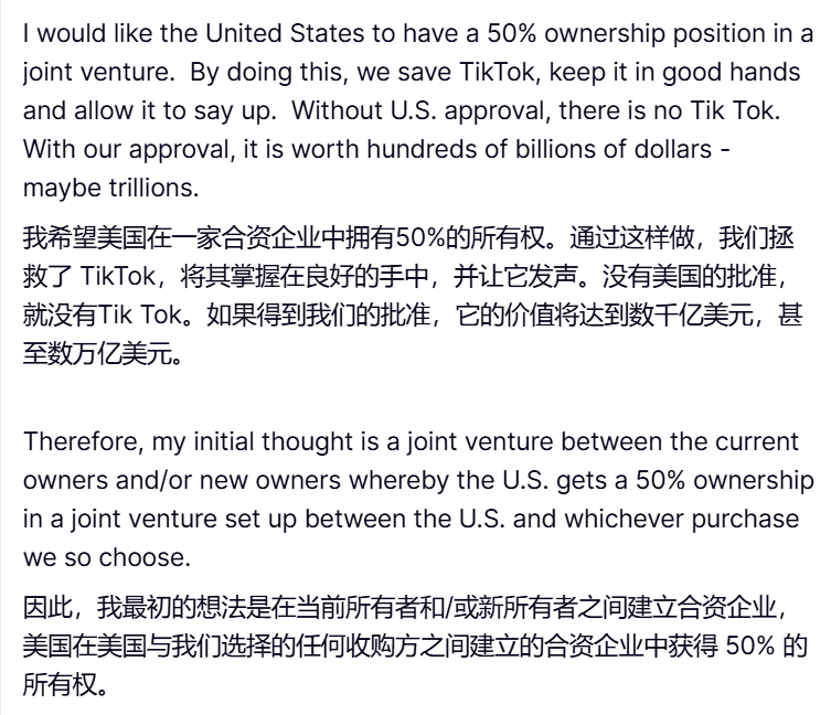 更何況,按照川普補充説明的信息來看。他所説的推遲協商,似乎還是希望能趁火打劫 50% 的所有權,用合資的方式來改造 TikTok 。