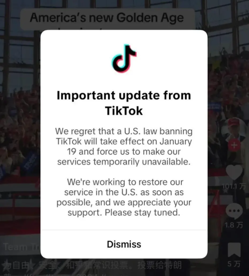 先是在封禁前一天,給用户們彈窗,分發自己要下線的悲壯消息。“ 我們感到很遺憾,美國封禁 TikTok 的法案將在 1 月 19 號生效,並迫使我們暫時無法提供服務。 ”