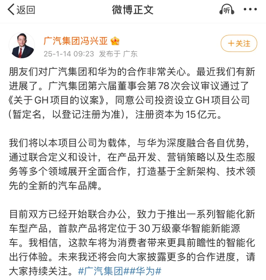2025年1月14日,廣汽集團總經理馮興亞表示,廣汽與華為車BU的合作已經邁入了新的階段,雙方團隊已經開始聯手合作,目標是推出一系列智能新車型。