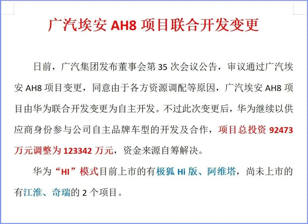 **2023年3月,廣汽宣佈,與華為達成的AH8項目,將從“聯合開發”變更為“自主開發”。**自此,在AH8項目中,華為的身份由“合作伙伴”變成了“供應商”。
