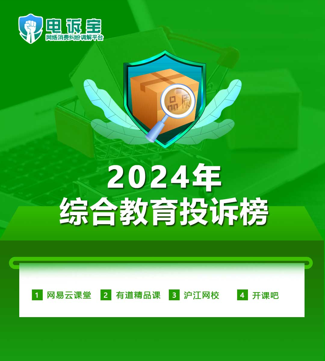 1月15日,網經社發佈《2024年綜合教育投訴榜》(依據投訴量排行),該榜單依據國內網絡消費專業消費調解平台“電訴寶”2024年受理的全國海量用户消費糾紛案例大數據生成。根據“電訴寶”2024年受理的綜合教育領域用户有效投訴顯示,入選投訴榜的依次為**網易雲課堂、有道精品課、滬江網校、開課吧。**此前,騰訊課堂等綜合教育平台也遭遇過類似投訴。