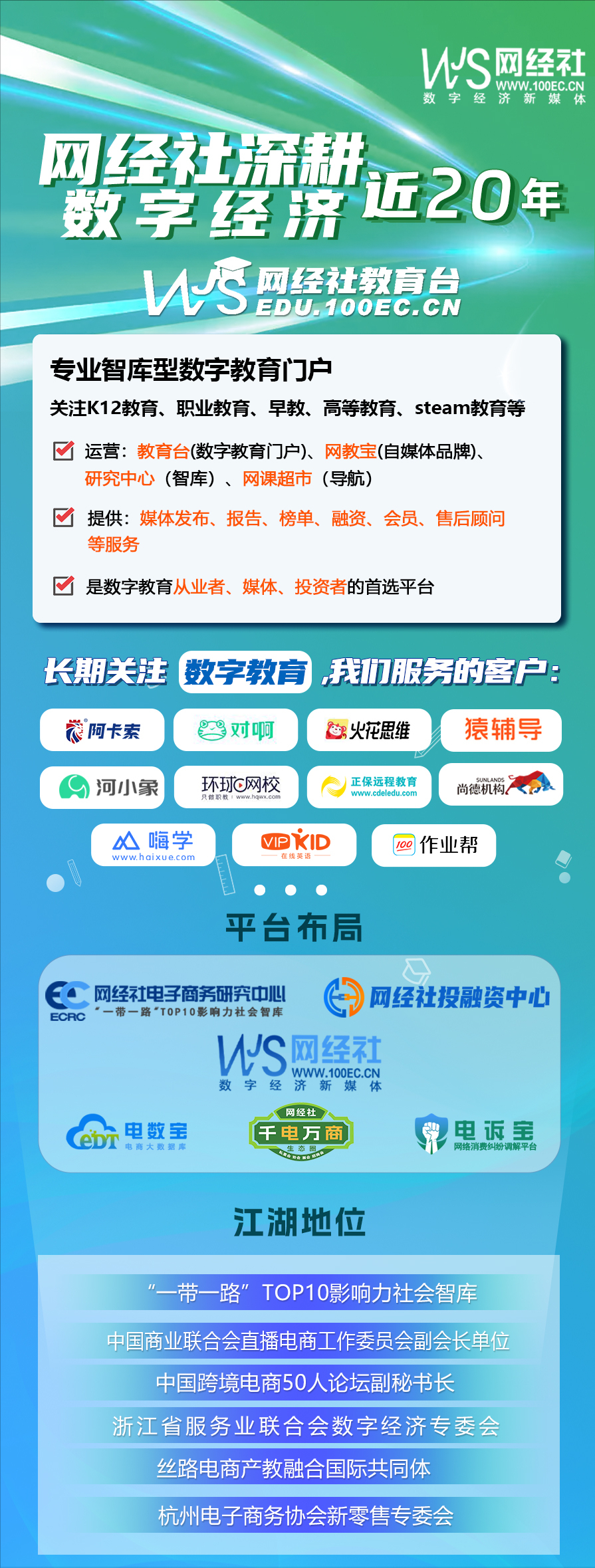 網經社教育台是專業智庫型數字教育門户,重點關注K12、職業教育、早教、高等教育、STEAM教育等。旗下運營有:教育台(數字教育門户)、網教寶(自媒體品牌)、研究中心(智庫)、網課超市(導航)等,提供媒體發佈、報告榜單、融資、營銷、供應鏈金融等。