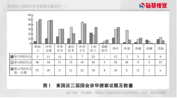 過去幾年,美國以“國家安全”頻頻將國內一些企業、研究機構“拉黑”。有學者對美國第115屆至117屆國會涉華提案議題進行了統計。如下圖所示,除了影響力、經貿金融,增長最快的議題便是醫藥衞生領域。