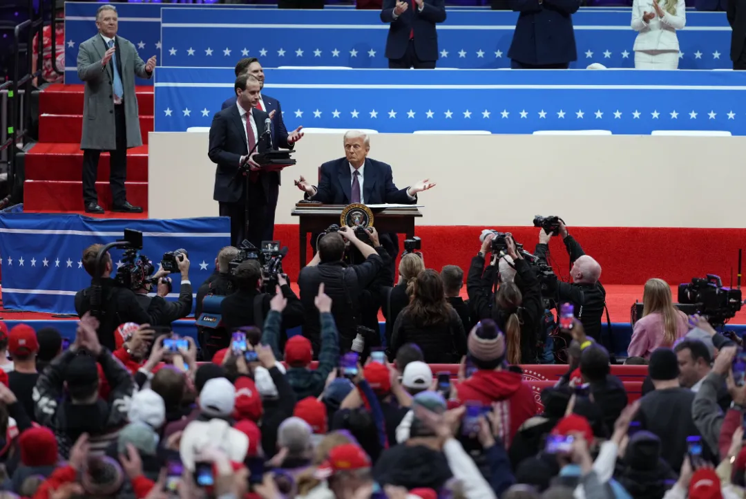 2)當天的活動有兩個不同尋常之處:第一,由於寒潮來襲,特朗普第二個任期的就職典禮從室外挪到了室內。那些參加典禮的人當中,就包括了七老八十的美國前總統、前副總統和美國最高法院的大法官,讓他們在料峭的寒風中苦熬幾個小時,真的會有生命危險;第二,特朗普團隊還在華盛頓第一資本體育館內安排了一場盛大的“慶功大會”。一向喜歡“演戲”的特朗普,在舞台上擺放了一個桌子,專門用來簽署旨在推翻拜登政府很多決策以及推行他自己執政理念的行政命令。看起來,特朗普非常享受這樣的時刻,他把自己用過的簽字筆扔給了現場的人羣。
