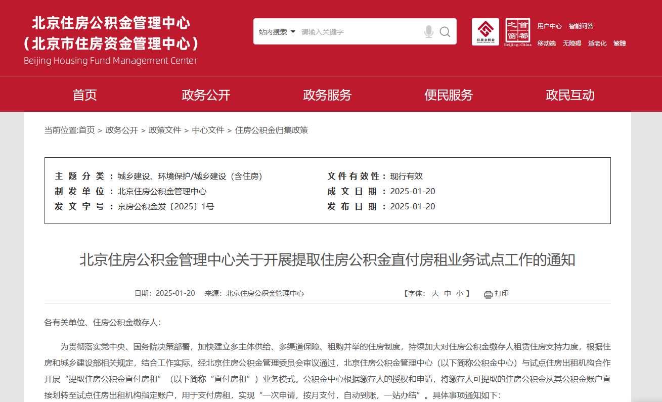 據北京日報相關消息,1月20日,北京住房公積金管理中心發佈《關於開展提取住房公積金直付房租業務試點工作的通知》。