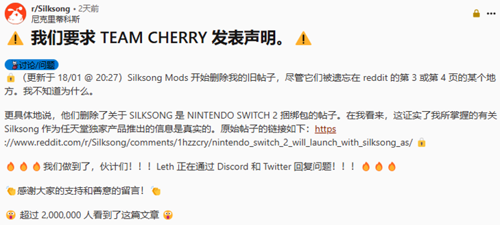 有人藉機號召玩家聯合起來發聲,共同向Team Cherry施壓,要求對方正面回答有關《絲之歌》的問題。