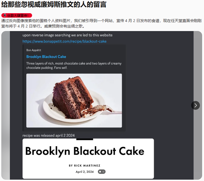 事情到這還不算完,一些玩家認為玄機其實在William的蛋糕頭像上——通過圖片搜索,有人發現這塊蛋糕的食譜是去年4月2日出現的,更巧的是,今年任天堂也會在同一天召開Switch 2直面會。