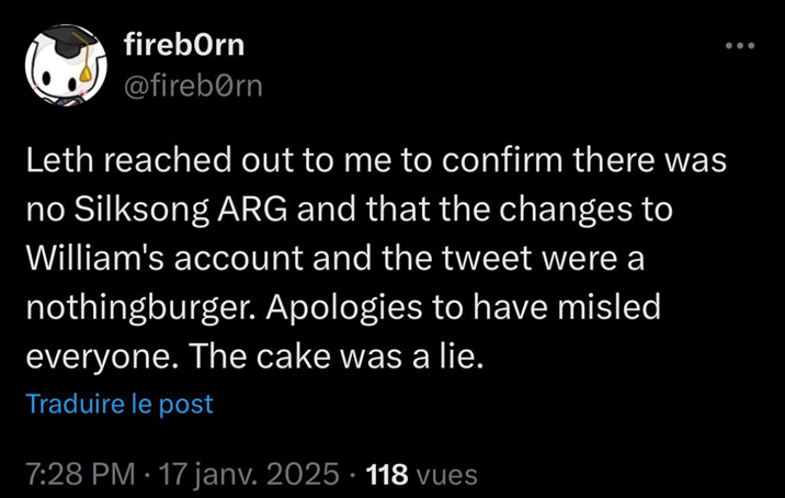 然而這個看上去有板有眼的推理很快就被推翻了。沒過多久,Youtube上一位主攻《空洞騎士》的主播fireb0rn突然發文,稱Team Cherry團隊和取得了他聯繫,對方表示William改賬號和那條推文都和《絲之歌》沒關係,很抱歉對大家造成了誤導。