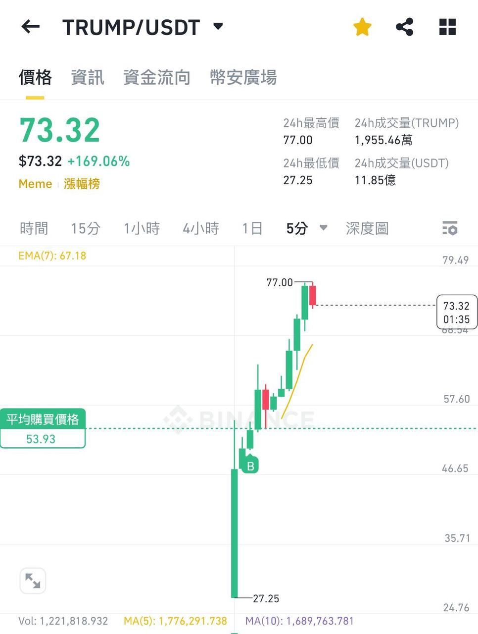$TRUMP 幣以每個幣 0.1824美元的價格開盤,隨後價格迅速飆升,最高一度炒到77美元一枚,漲幅高達422倍。而川普幣的總市值一度突破 800億美元。