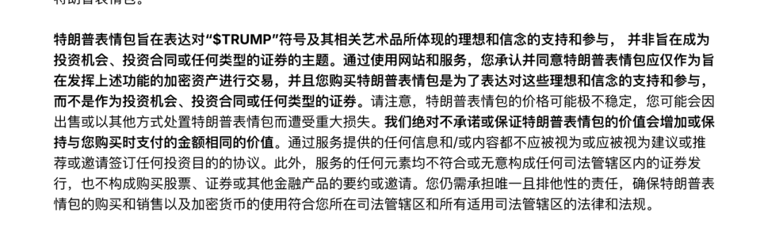 同樣的,$TRUMP在白皮書中也説了一段話,你買這個幣,是要知情,你不是買來投資的,而是作為一種對特朗普事業的友情式的支持。