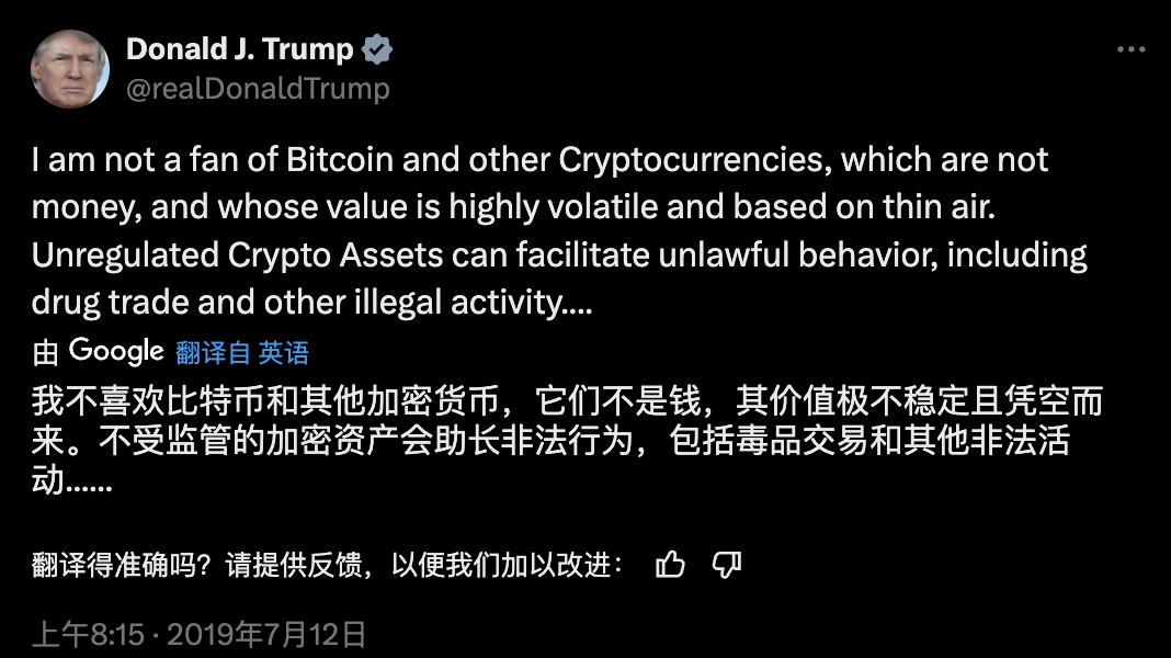 2019年,川普義正詞嚴地説道:“我不喜歡加密貨幣,它們不是真錢…… ”還巴拉巴拉説了一堆這是騙局之類的話。
