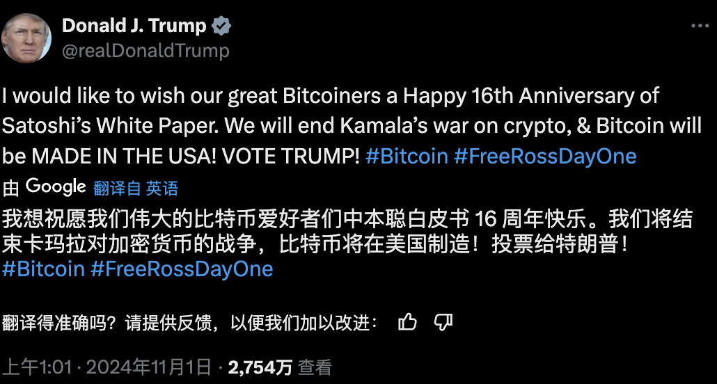 2024年11月1日,川普給比特幣慶生:“祝願中本聰白皮書16週年快樂。”