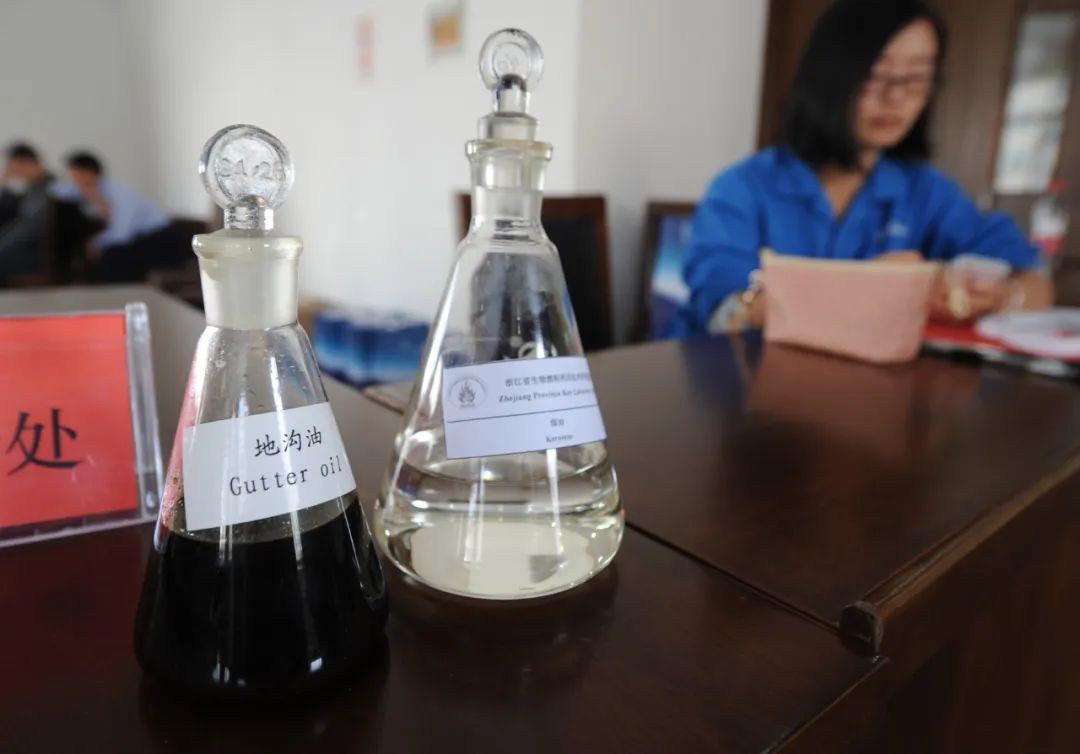 地溝油(左)及經過雜質清除後獲得的煤油樣品