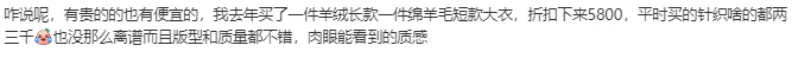 “羊絨大衣最好的兩家就是鄂爾多斯和之禾,款式好看,羊絨非常細膩輕柔,穿在身上很輕又保暖又時尚,至於maxmara,羊絨大衣比那倆家的質地粗糙,還重,版型也不適合我,因為我是小個子,最重要的是便宜好幾倍,前幾年大衣還沒上萬的時候我買過幾件鄂爾多斯和之禾,夠穿了,以後不買了。”
