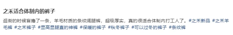 除了精緻白領,一些體制內工作者也將之禾視作心頭好。“一直很喜歡之禾,剪裁版型落落大方,面料材質優質舒適,怎麼買怎麼搭都不會出錯。”