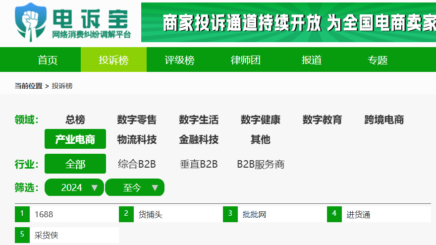 據網絡消費糾紛調解平台“電訴寶”數據顯示,2024年至今產業電商領域投訴依次為:1688、貨捕頭、批批網、進貨通、採貨俠。此前,也曾收到過優市、網商園、中國網庫、衣聯網、新鬼科技、互站網、義烏購等類似平台投訴。