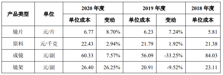而據其招股説明書披露的主要產品的單位成本,明月鏡片動輒數百元甚至上千元的眼鏡,其鏡片的單位成本、眼鏡成鏡的成本都與其售價相差懸殊。招股書數據顯示,2020年,一片鏡片的單位成本僅6.77元,一副眼鏡成鏡的單位成本僅60.33元。
