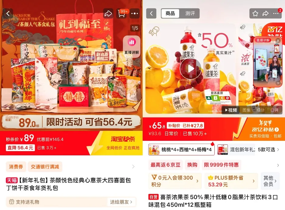 鋅刻度從天貓、京東等電商平台看到,喜茶12瓶裝濃果茶年貨禮盒和12瓶裝輕果茶年貨禮盒售價分別65.8元和47.5元,多平台累積銷量超過15萬份;茶顏悦色人氣茶食年貨禮盒售價89元,銷量超過5萬份。