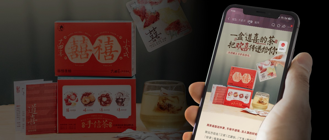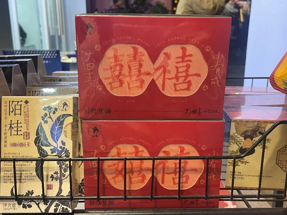 在伴手禮板塊中與喜茶競爭較為激烈的是茶顏悦色“大四喜”茶包禮盒,大紅色的外包裝加上醒目的喜字,也十分符合新婚的氛圍感。樂樂茶的喜宴禮盒設計也與之類似,主打喜慶和實用。