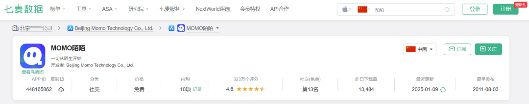 圖:七麥數據顯示,2025年1月中旬在蘋果應用商店的單日下載量為3284次。而soul、陌陌均在萬次以上