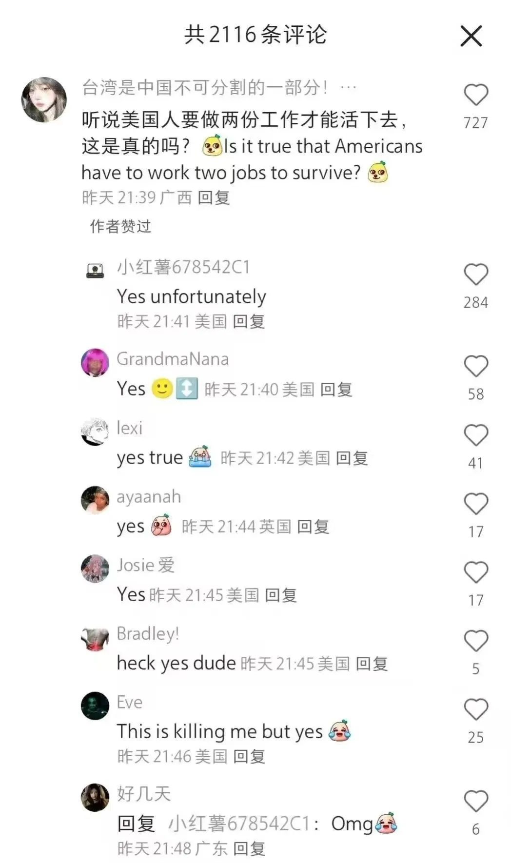 而對於很多“苦意林久矣”的中國網友,這次終於是能夠從正宗美國人那裏親身見證濾鏡破碎的時刻,史稱**“中美賽博對賬”**。
