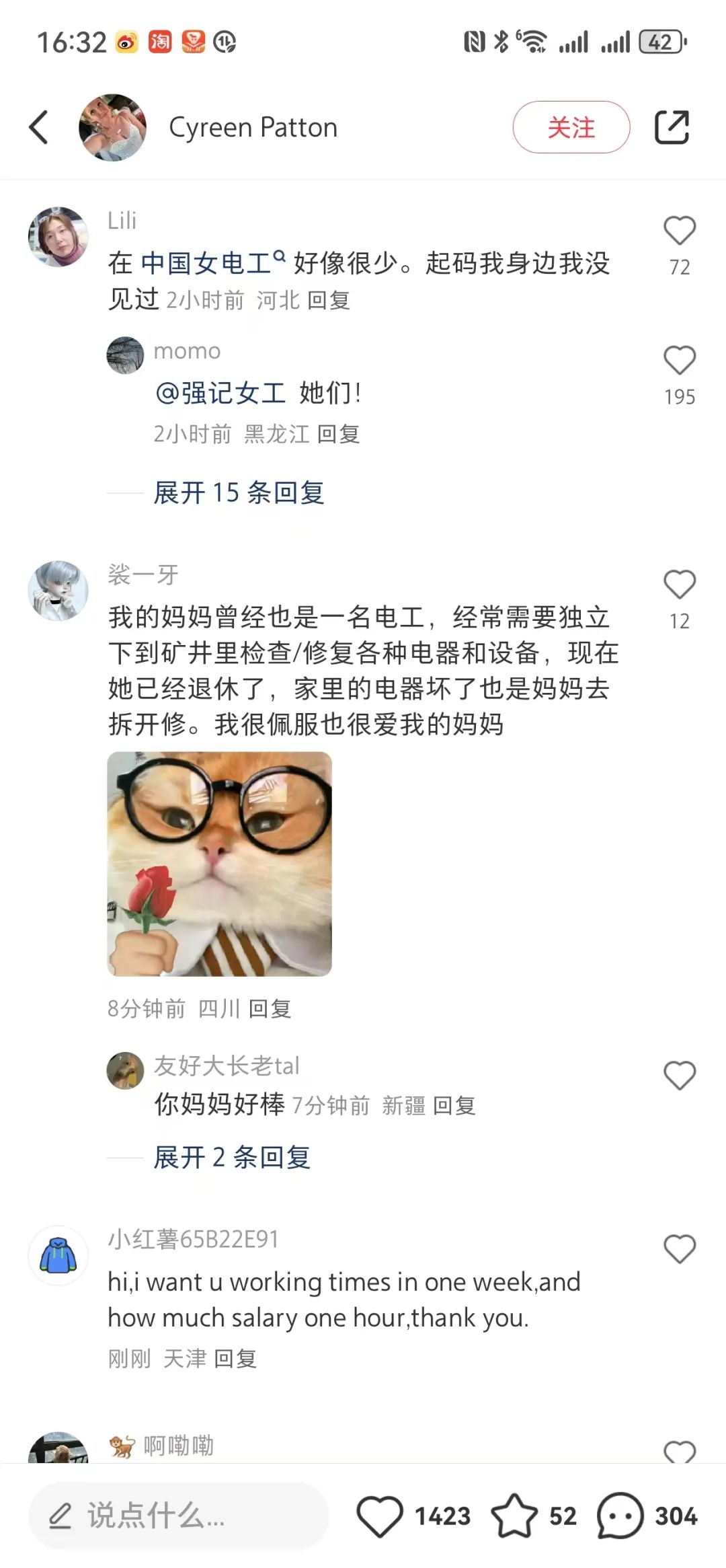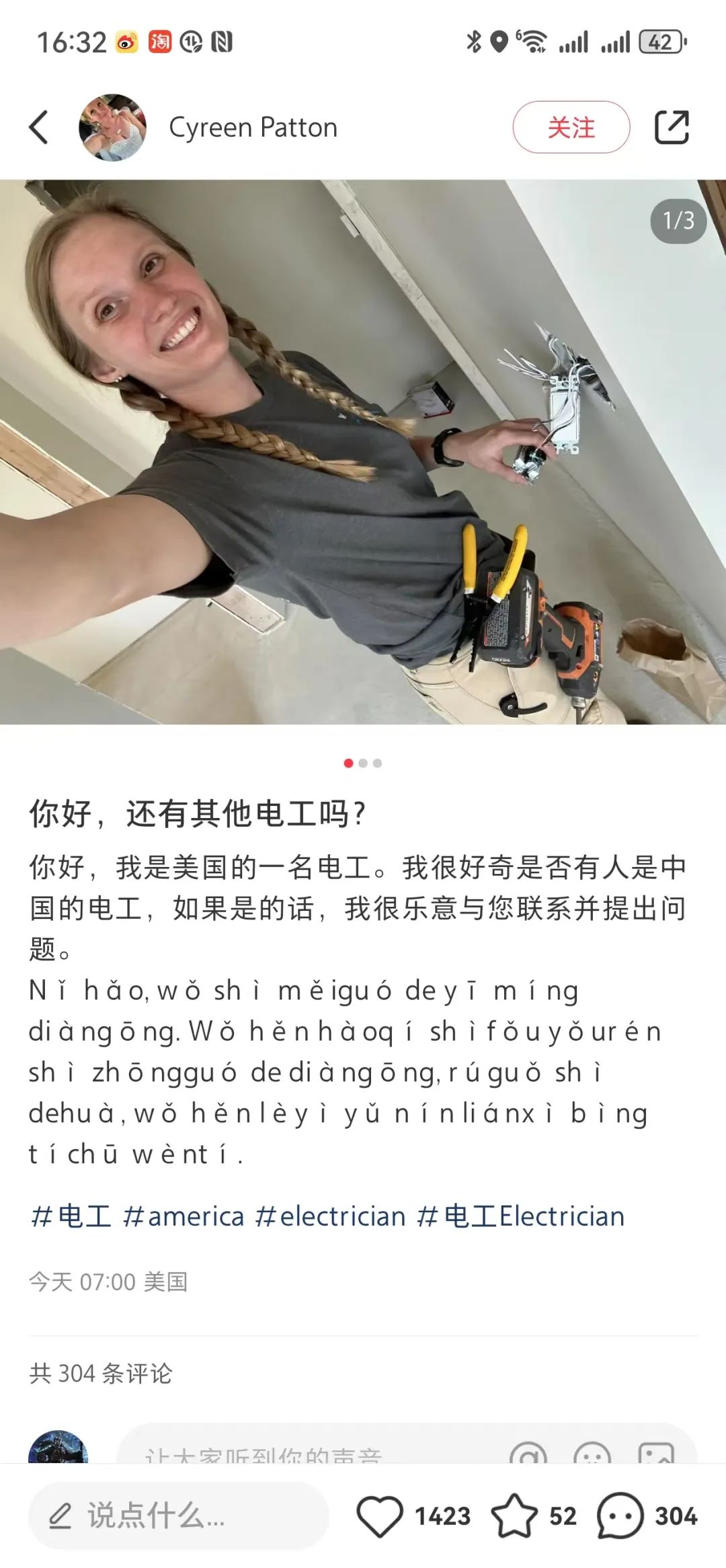 還有美國的女電工也分享了自己的日常,並期待和中國的同行有交流。