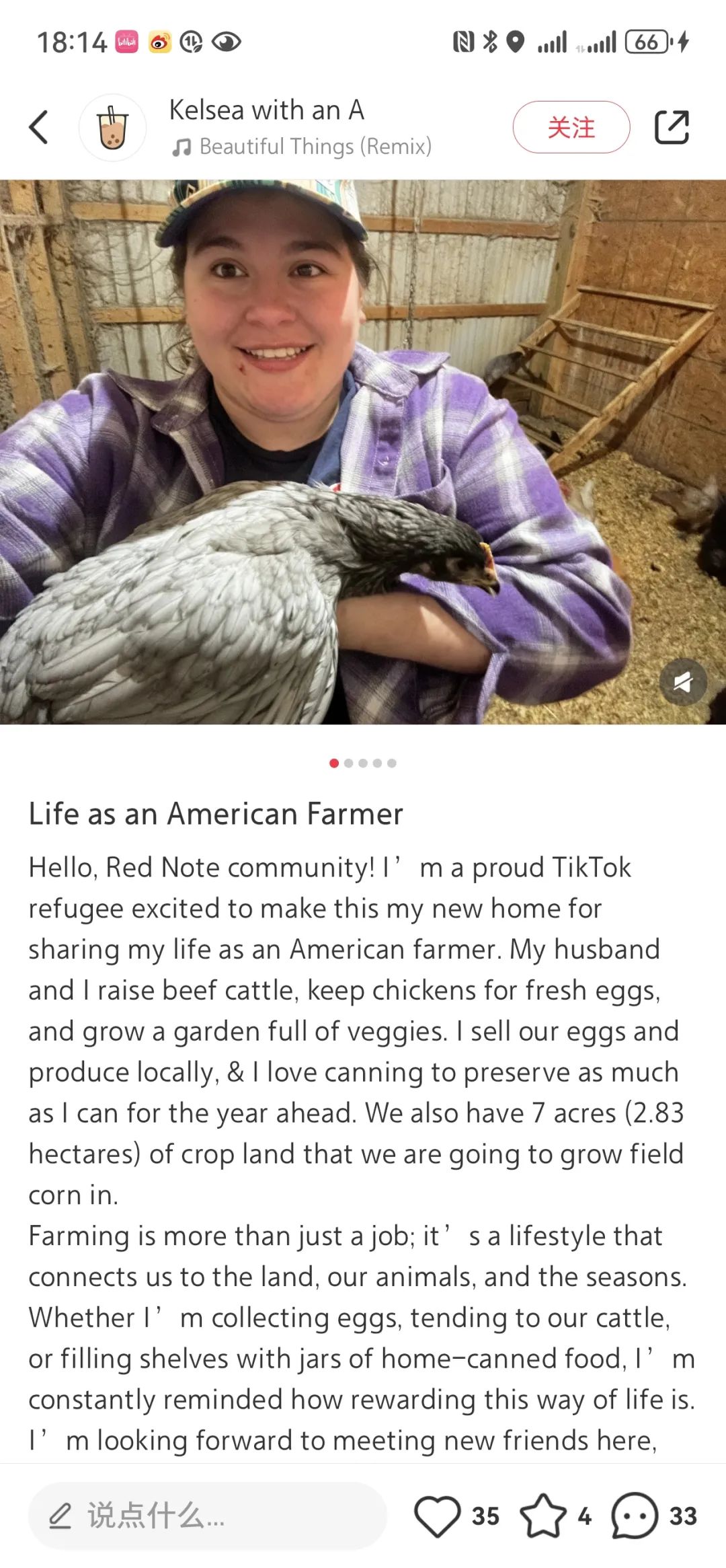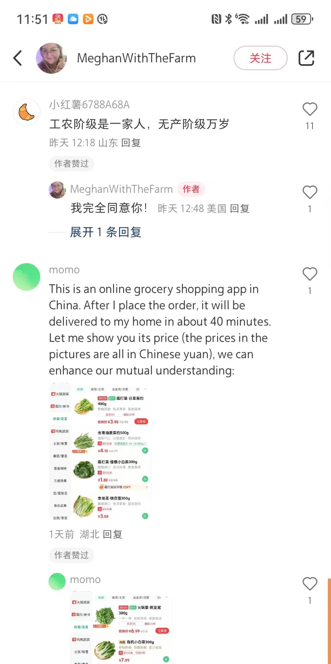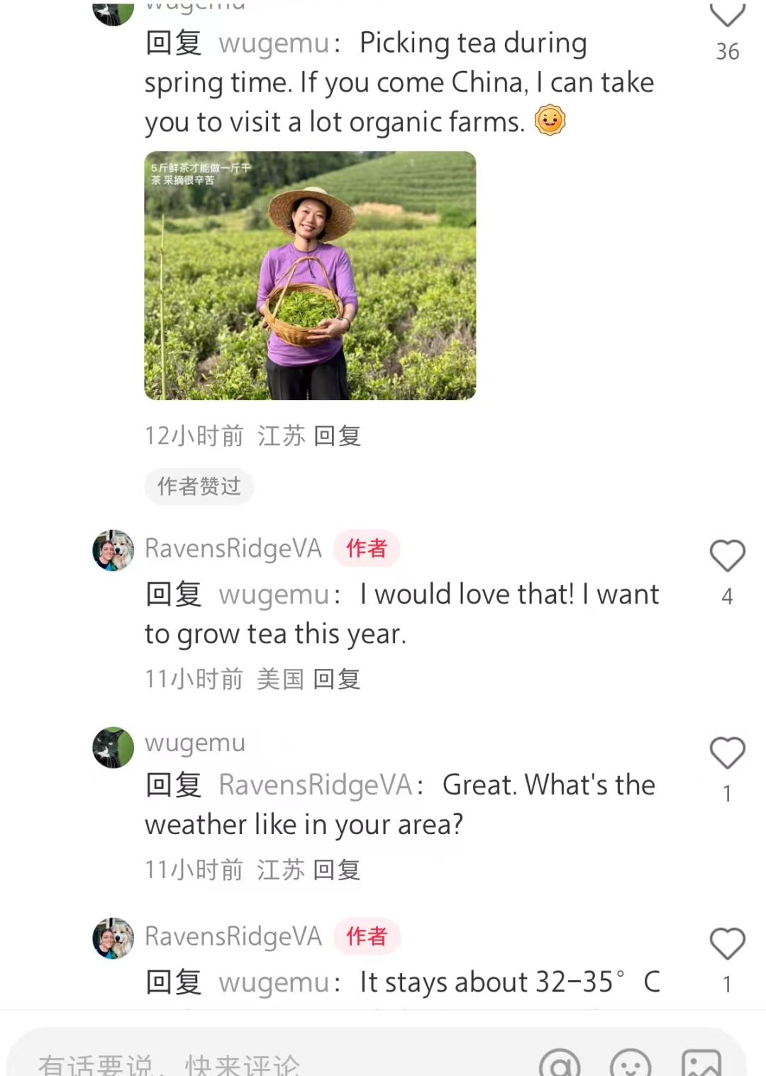 比如這位來自美國的農民大姐,分享了自己的農場日常後,很快評論區出現了另一位來自江蘇的同行來留言。