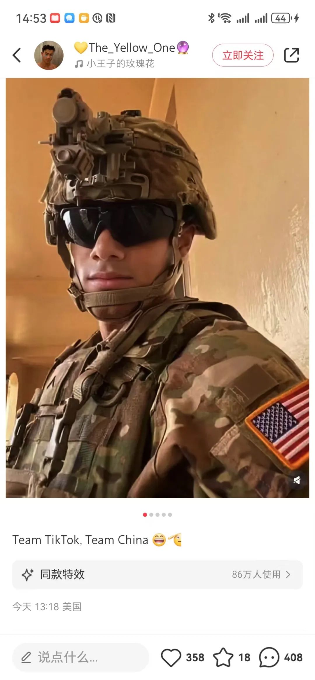 這其中以駐紮美國本土的普通士兵為主。他們分享的內容相對統一,都是身着軍裝,不過展示的風格迥然不同,有的人試圖展示自己作為美軍“威武強大”的一面,特別穿好了全套的戰術裝備。
