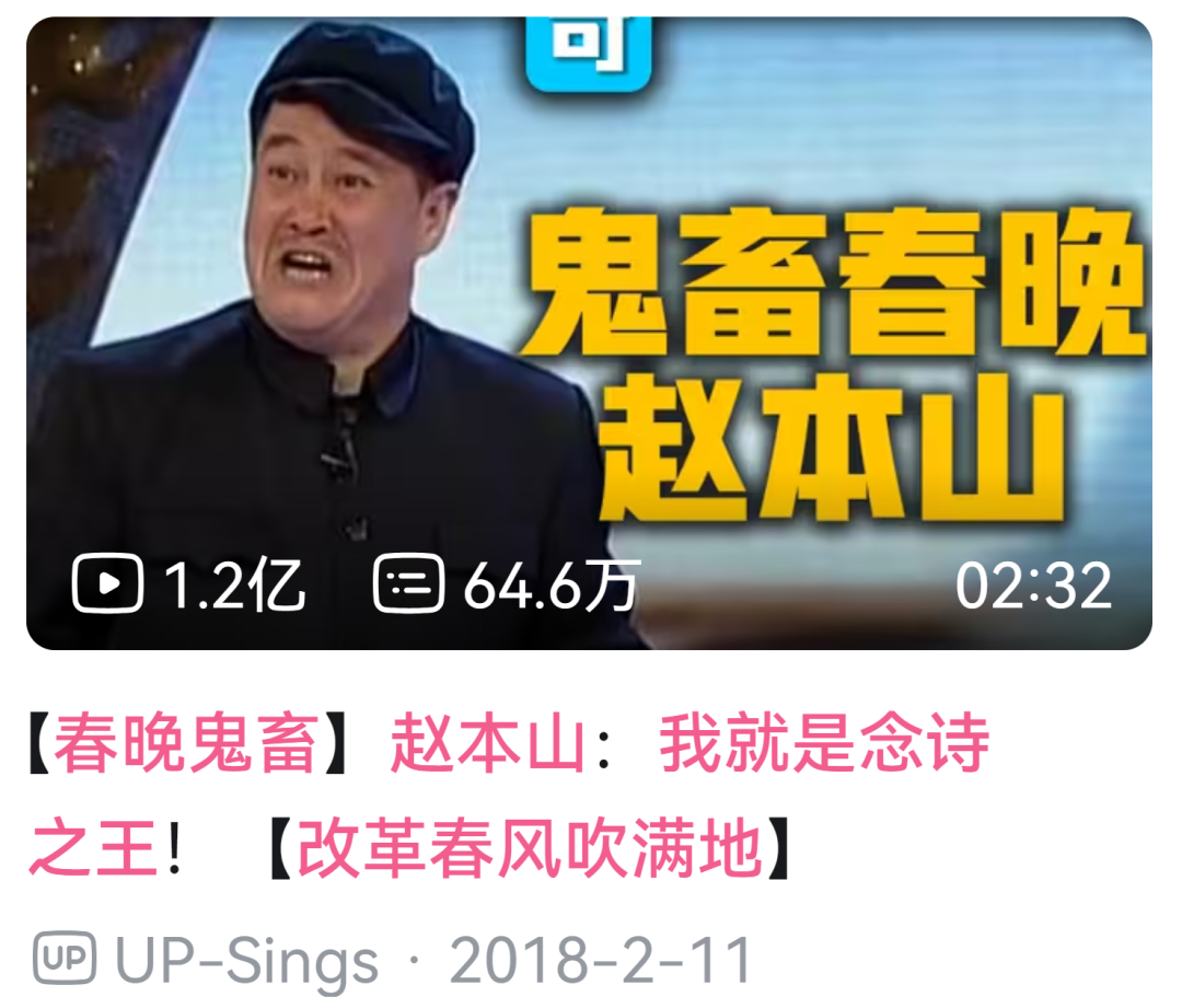 在B站上搜索關鍵詞“春晚”,內容五花八門、題材多樣。在“春晚混剪”類目中,@UP-Sings 2018年發佈的《【春晚鬼畜】趙本山:我就是念詩之王!【改革春風吹滿地】》如今已收穫1.2億播放量,被收錄至“入站必刷98大視頻”;而“經典節目回顧”上,也有@MarcusPierce 發佈的《1990年春晚小品<主角與配角>》斬獲1289.7萬播放量,1.7萬評論裏幾乎每三天就有人掀起一波“回憶殺”。