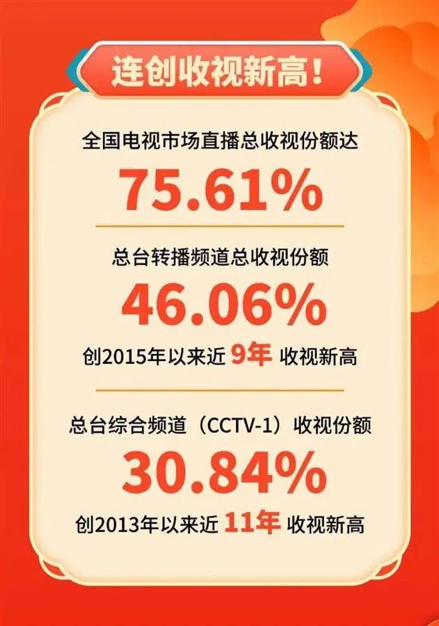 從電視端看,2024年春晚直播總收視份額達75.61%。其中,總枱轉播頻道總收視份額46.06%,創近9年收視新高。