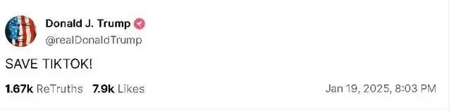 1月20日上午,候任總統特朗普在其社交媒體平台Truth Social上發文,宣佈將暫停該法律的執行,並承諾擴大對支持TikTok的科技公司的法律保護。特朗普表示,他將在下一步使用總統行政令,將美國高院發佈的禁令延期90天。