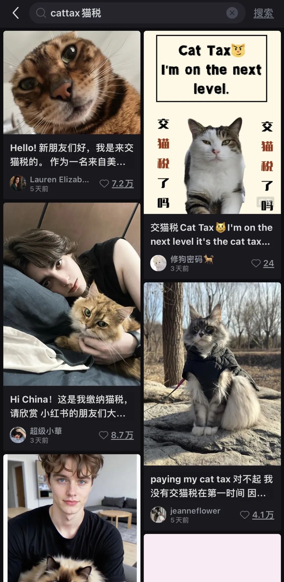 這個標籤也引發了一些有趣的梗,比如“交貓税”。外國友人本着友好交流的態度發帖,希望能和中國人交朋友。