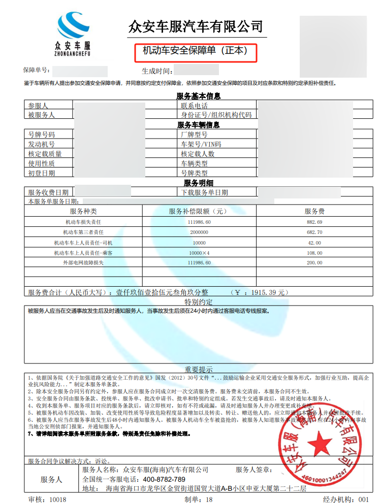 不久後,徐先生車輛發生小剮蹭事故,他隨即撥打了保單上眾安車服客服電話查詢保單,卻被對方拒絕出險。仔細查看保單,徐先生髮現其與正常保單相似,但標題為“機動車安全保障單”,單子中的有償性條款等與正規保單也有差別。