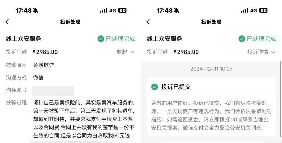 劉先生立刻通過微信支付渠道進行二次投訴,當天就收到原路返回的全部保費金額。劉先生在社交平台發佈了自己受騙追回保費的經歷,截至目前,已有30多位經歷類似的消費者與他取得聯繫,諮詢退款方法。“這類公司太多了,不止一個眾安車服,大家一定要擦亮眼睛。”劉先生説。