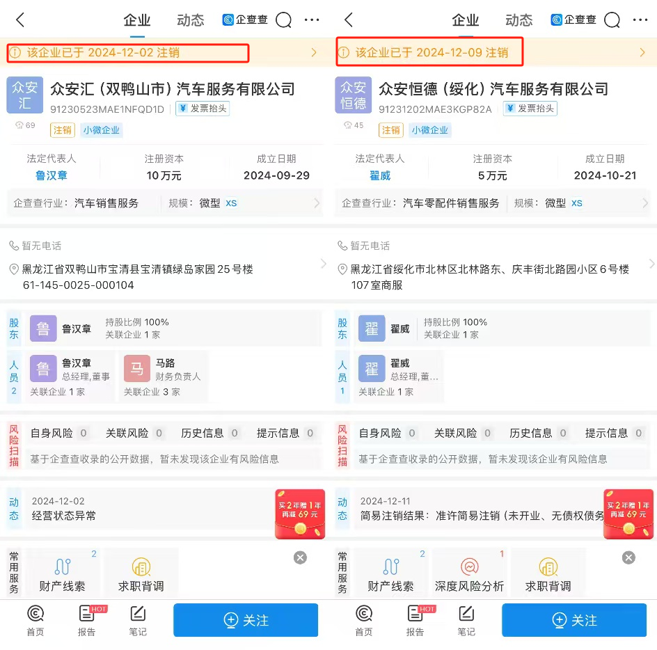 記者通過企查查查詢發現,上述公司均在2024年下半年註冊成立,註冊資本在5萬~10萬元不等,公司註冊地多為黑龍江省各市。目前,包含眾安車服在內的多個公司存在“經營異常”等情況,其中眾安匯(雙鴨山市)已於2024年12月2日註銷,眾安恆德(綏化)於2024年12月9日註銷。