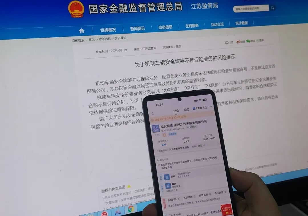 2024年9月,國家金融監管總局江蘇監管局發佈《關於機動車輛安全統籌不是保險業務的風險提示》,表示機動車輛安全統籌並非保險業務,經營此類業務的機構未依法取得保險業務經營許可,不是依法設立的保險公司,不是國家金融監督管理總局及其派出機構的監管對象。如發生交通事故出現糾紛,消費者的合法權益無法依據保險法得到保障。