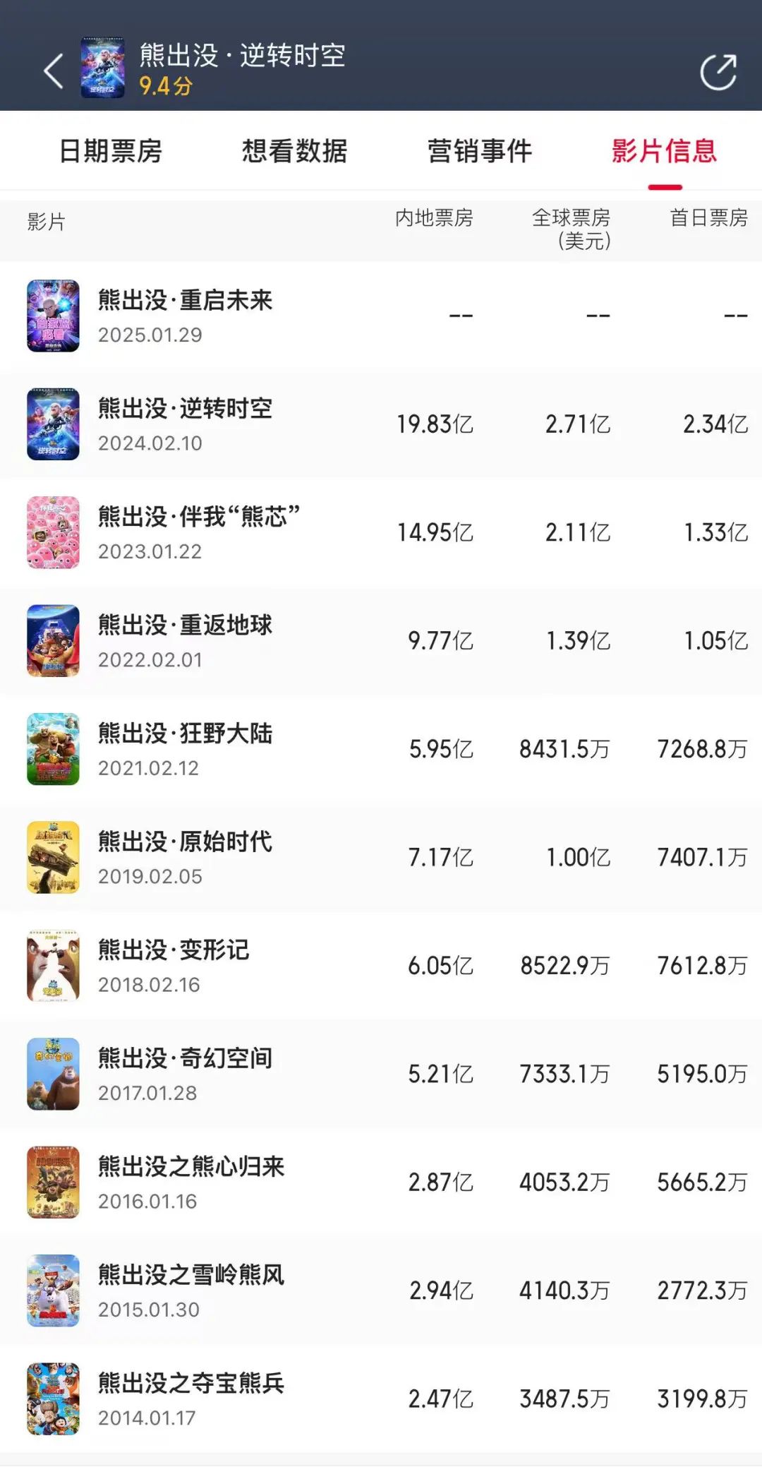 《熊出沒》屬於少兒電影,通常一個低齡兒童至少需要一個成人陪伴,所以票房不可小覷。可以看到這個IP的票房成績一路高歌猛進,2024年春節檔《熊出沒-逆轉時空》票房19.83億,比很多成年人觀看的電影票房更好。而今年的《熊出沒·重啓未來》是科幻五部曲的最終篇章,不僅在動畫製作技術上不斷進步,更在內容上加入了奇幻、神話、科幻等眾多元素,目前看至少兒童市場的大盤較為穩定。
