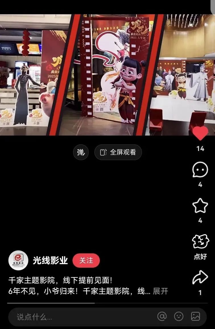 年初開始,久違的線下物料和院線營銷活動接踵而來,揚州、南京和宜春等城市的影城把哪吒、敖丙和申公豹的人形立牌擺出來,形成打卡點,路人在人形立牌前駐足拍照,還能獲得影城贈送的哪吒AR卡片。