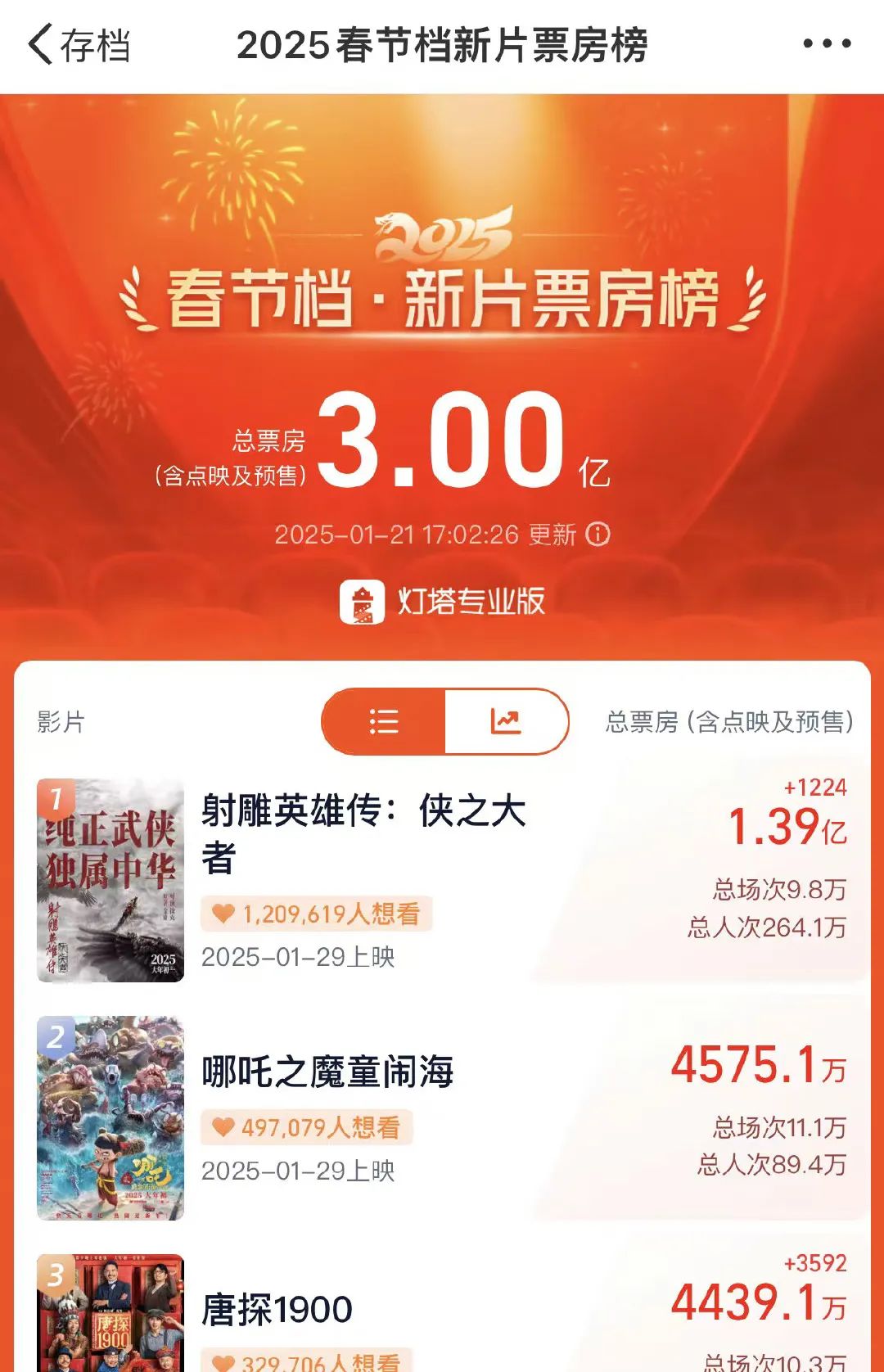 據燈塔專業版,截至1月21日16時50分,2025年春節檔上映新片預售總票房突破3億元。