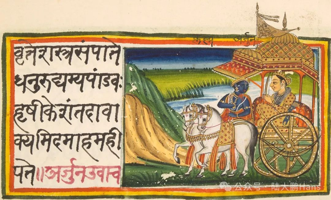 [4] 《薄伽梵歌》是印度教的經典之一,字面意思為“神之歌”,共有700節詩句,收載在印度兩大史詩之一《摩訶婆羅多》中。成書時間約為前5世紀至前2世紀。此書對於印度思想界有莫大的影響,而且是近世印度思想家的精神支柱。《薄伽梵歌》採取對話形式,借阿周那王子與大神黑天的問答,論述在既存的社會制度之中,必須毫無私心地各盡本分,以及應當對唯一的神作絕對的歸依與奉獻。由於所含的思想極為複雜,因此在哲理與實踐、信仰與現世的關聯上,常有矛盾與不統一之處,但仍然是全印度教徒的福音書、信徒的座右銘,至今仍是印度人誦讀的經典。