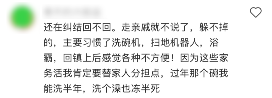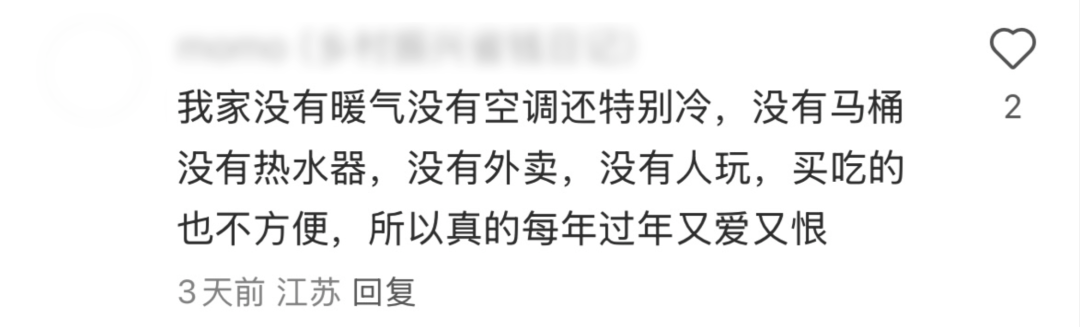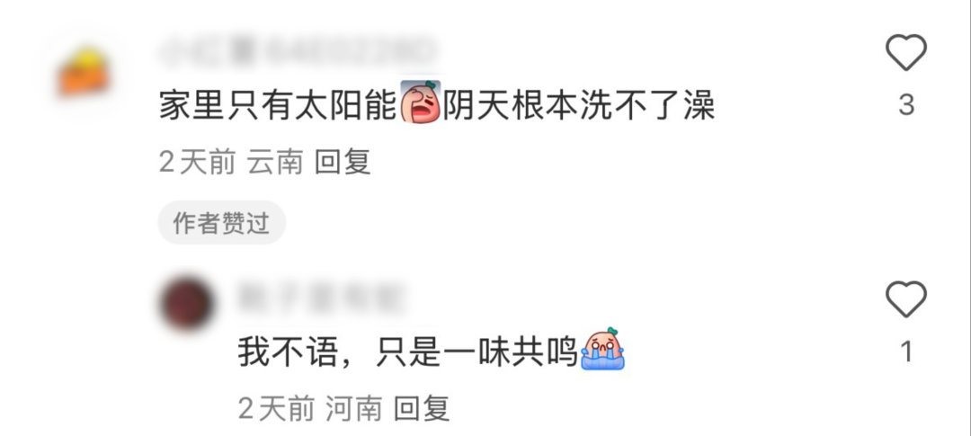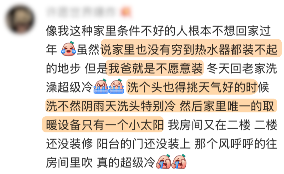 有網友説家裏只有太陽能熱水器,陰天根本洗不了澡。類似的有人因為家裏沒有暖氣沒有空調,每年過年真的又愛又恨。