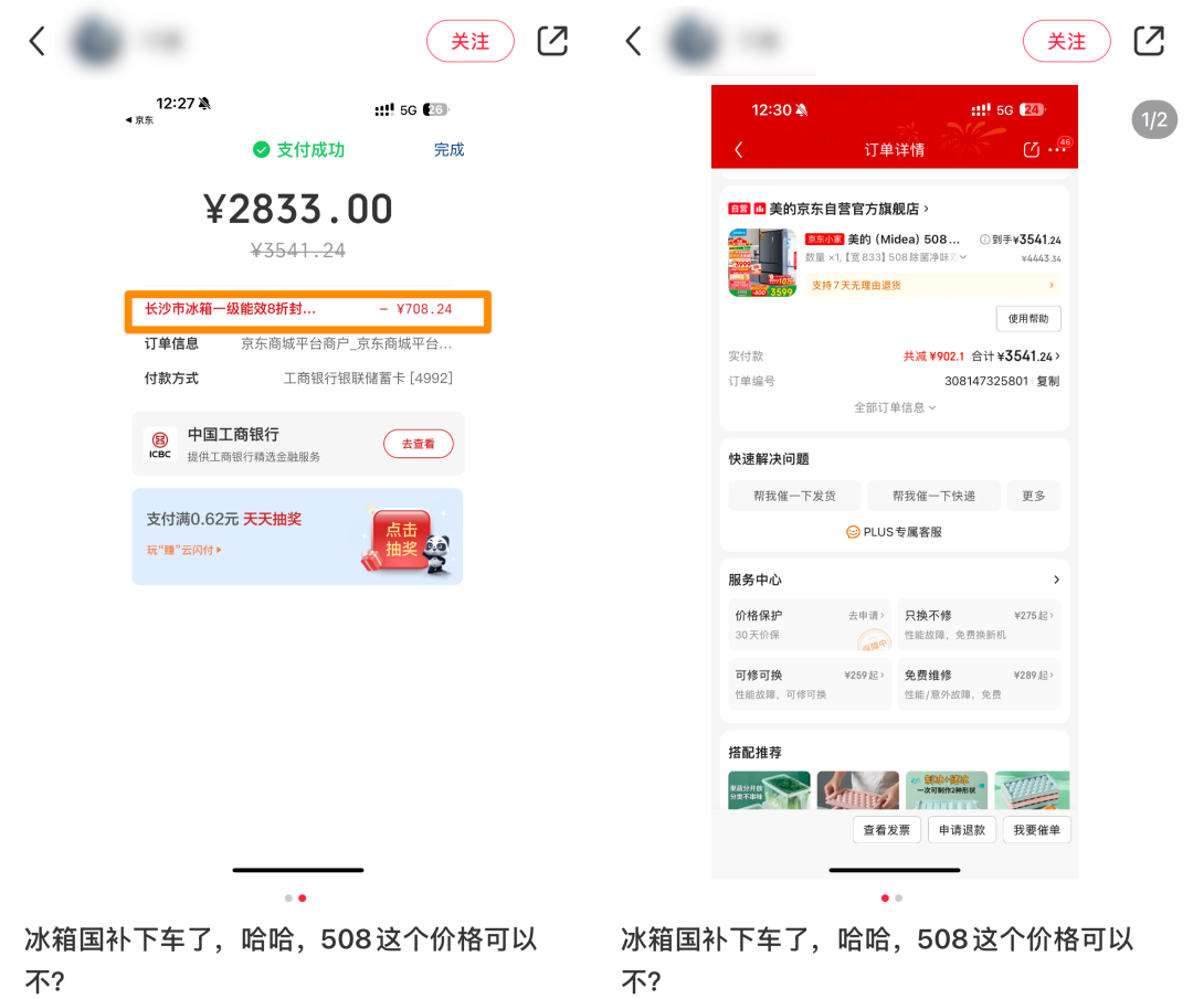 也有長沙網友成功下車,用 2800 的價格買到了原價 3500 的美的法式多門冰箱,其中國補硬生生省下了 700 元。