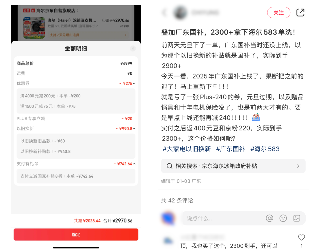 其中廣東國家補貼幫他省了 742 元,以舊換新舊家電省了 990 多,京東優惠券還減了 275 元。